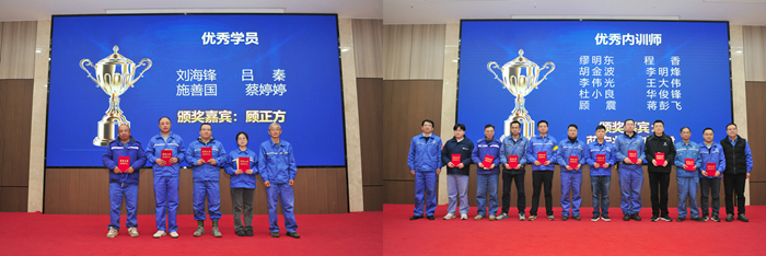 在結(jié)業(yè)儀式上,4名優(yōu)秀學(xué)員代表分別結(jié)合自身參與的《揚(yáng)子江造船解決方案》(YSS 2.0)、電子化廠圖等課題,分享了數(shù)字化轉(zhuǎn)型實(shí)踐中的經(jīng)驗(yàn)與感悟。2025年集團(tuán)內(nèi)訓(xùn)師全年授課量達(dá)732課時(shí),培訓(xùn)人次超2.5萬,其中安環(huán)條線人均授課17課時(shí),生產(chǎn)條線人均14課時(shí),展現(xiàn)了內(nèi)訓(xùn)師團(tuán)隊(duì)的強(qiáng)大賦能能力?,F(xiàn)場表彰了4名“智改數(shù)轉(zhuǎn)專項(xiàng)優(yōu)秀學(xué)員”和10名“優(yōu)秀內(nèi)訓(xùn)師”,公司領(lǐng)導(dǎo)為獲獎(jiǎng)?wù)哳C發(fā)證書及獎(jiǎng)金。
