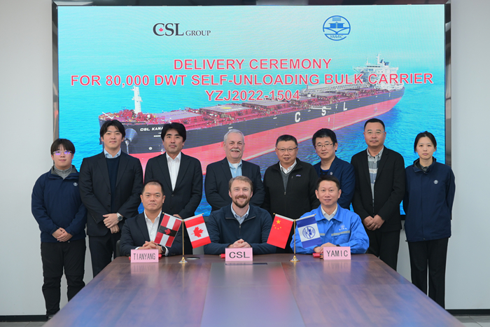 12月18日,船東代表Andrew Lennox先生、我集團副總經(jīng)理兼揚子三井總經(jīng)理宋書明先生及揚子三井CFO石丸雄次先生共同簽署“CSL KANATA”輪交船文件。祝愿新船航行平安、滿載順達、一帆風順!