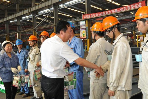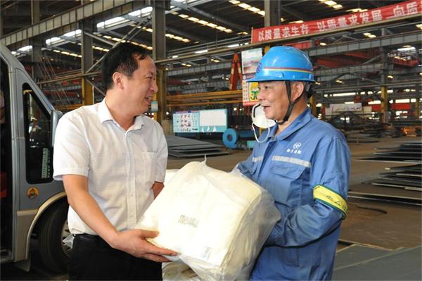 胡榮華副主席帶隊(duì)慰問了在高溫下堅(jiān)守工作崗位的新?lián)P子加工車間員工,給他們送去防暑降溫物品,他代表市委、市政府向頂著烈日奮戰(zhàn)在一線的全體工友表示慰問。之后,市總領(lǐng)導(dǎo)一行還對我集團(tuán)上半年度工會工作進(jìn)行了調(diào)研。在聽取工會王主席對我司上半年主要的工會工作和職工活動介紹后,胡副主席用“四個(gè)有”評價(jià)了我們的工作,即“企業(yè)發(fā)展有條不紊、工會工作井井有條、活動開展有聲有色、服務(wù)職工有心有愛”當(dāng)天,市總共為我們送來了400條毛巾和5箱礦泉水的慰問品。